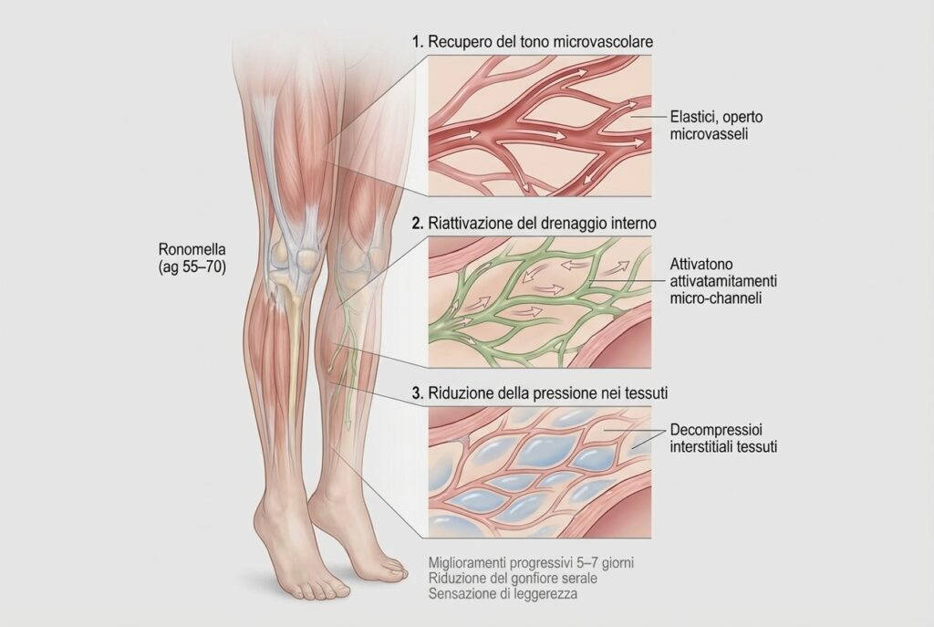 Un approccio clinico che lavora sulla causa funzionale del gonfiore: pressione tissutale, stasi microvascolare e drenaggio compromesso.